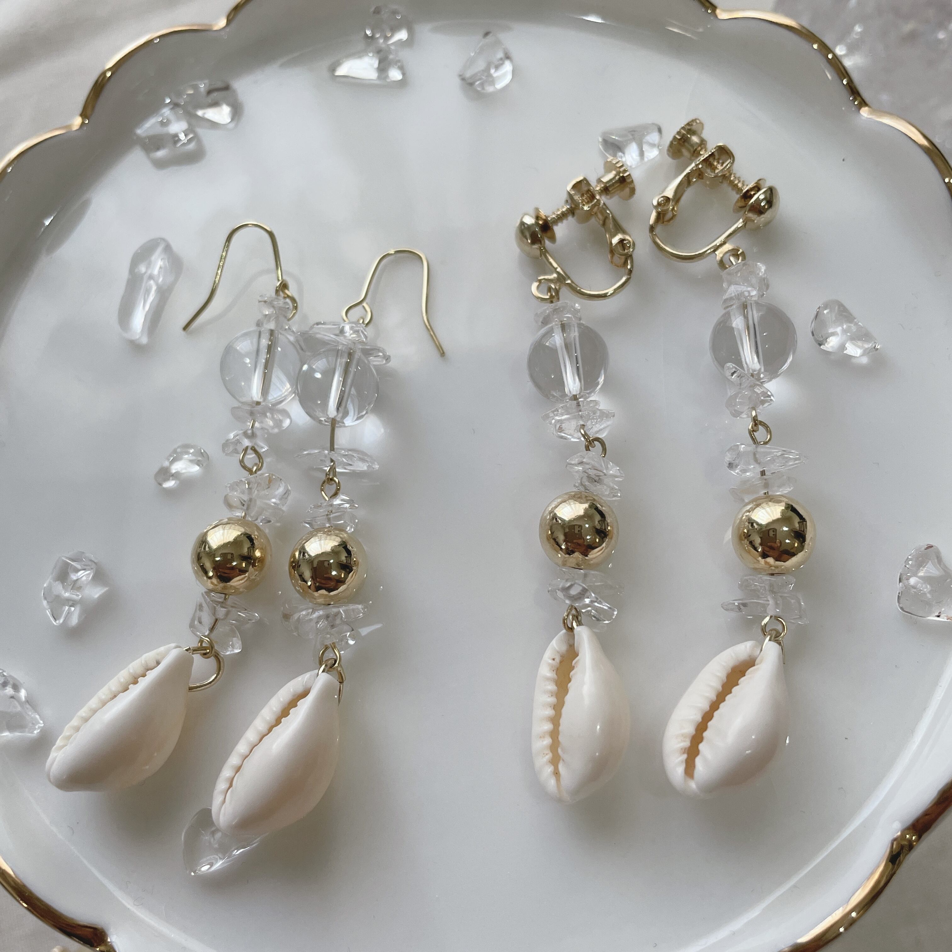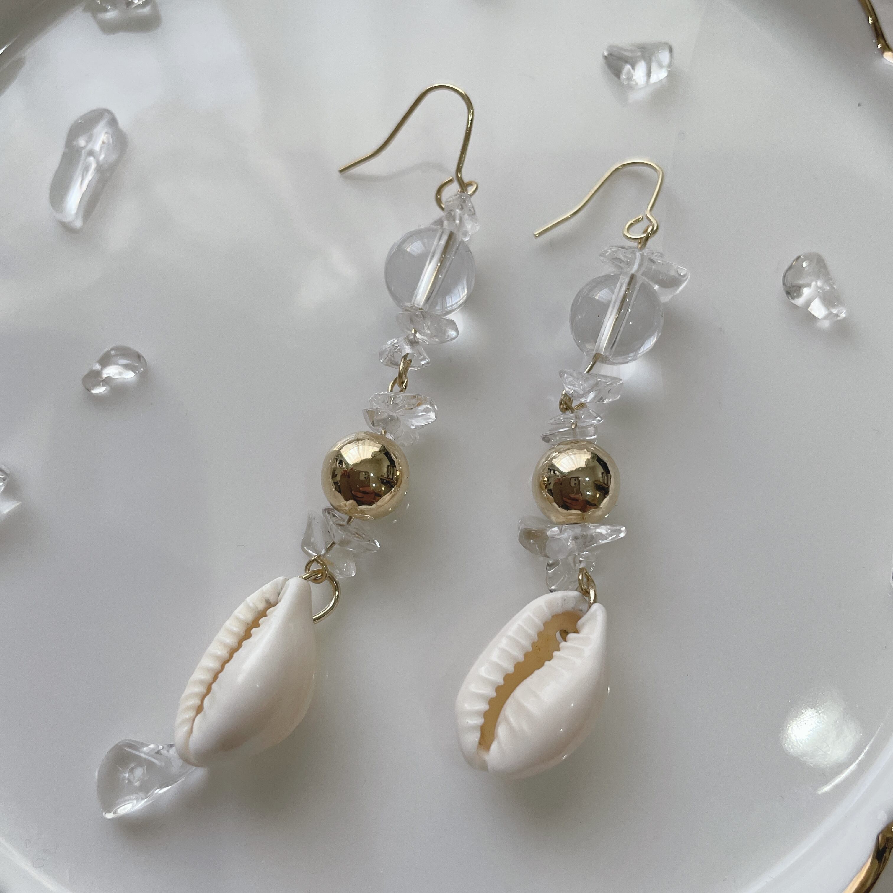 夏にぴったりのタカラガイをメインに使用したピアス。トップにクリスタル(水晶)使用し、間にはゴールドの銅玉を使いました。チップもクリスタルを使用。